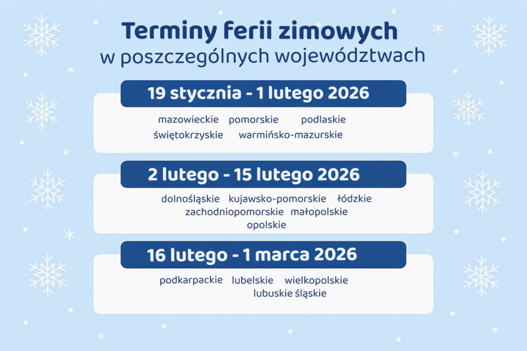 W roku szkolnym 2025/2026 przerwa zimowa została podzielona na trzy terminy przypisane do poszczególnych województw. Taki system pozwala zmniejszyć tłok w popularnych miejscowościach turystycznych i ułatwia organizację wyjazdów.